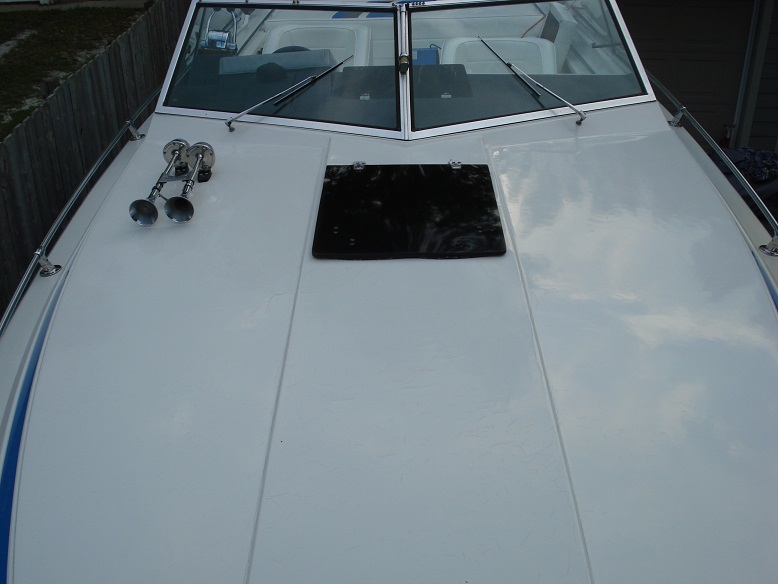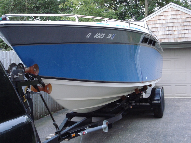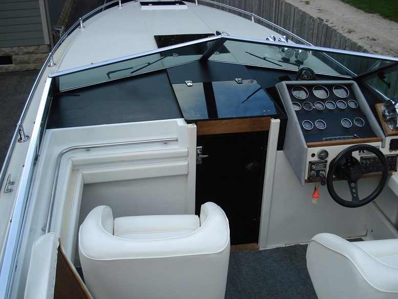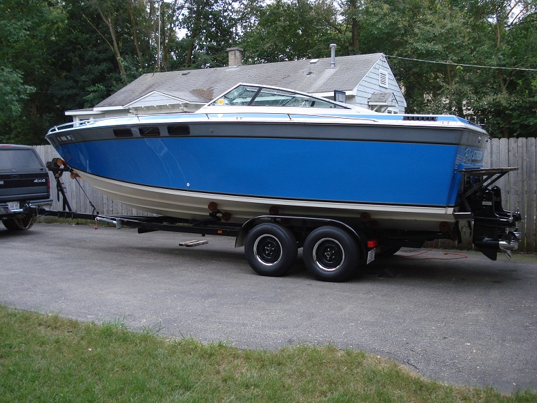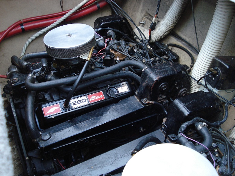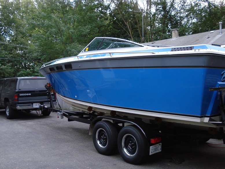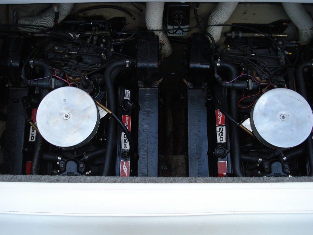 Length 25 1/2', Beam 8', Twin Mercruiser Chevy 350 motors, GPS 53 mph, 125 gal fuel tank, 20 gal fresh water, RV pump out style porta-potti